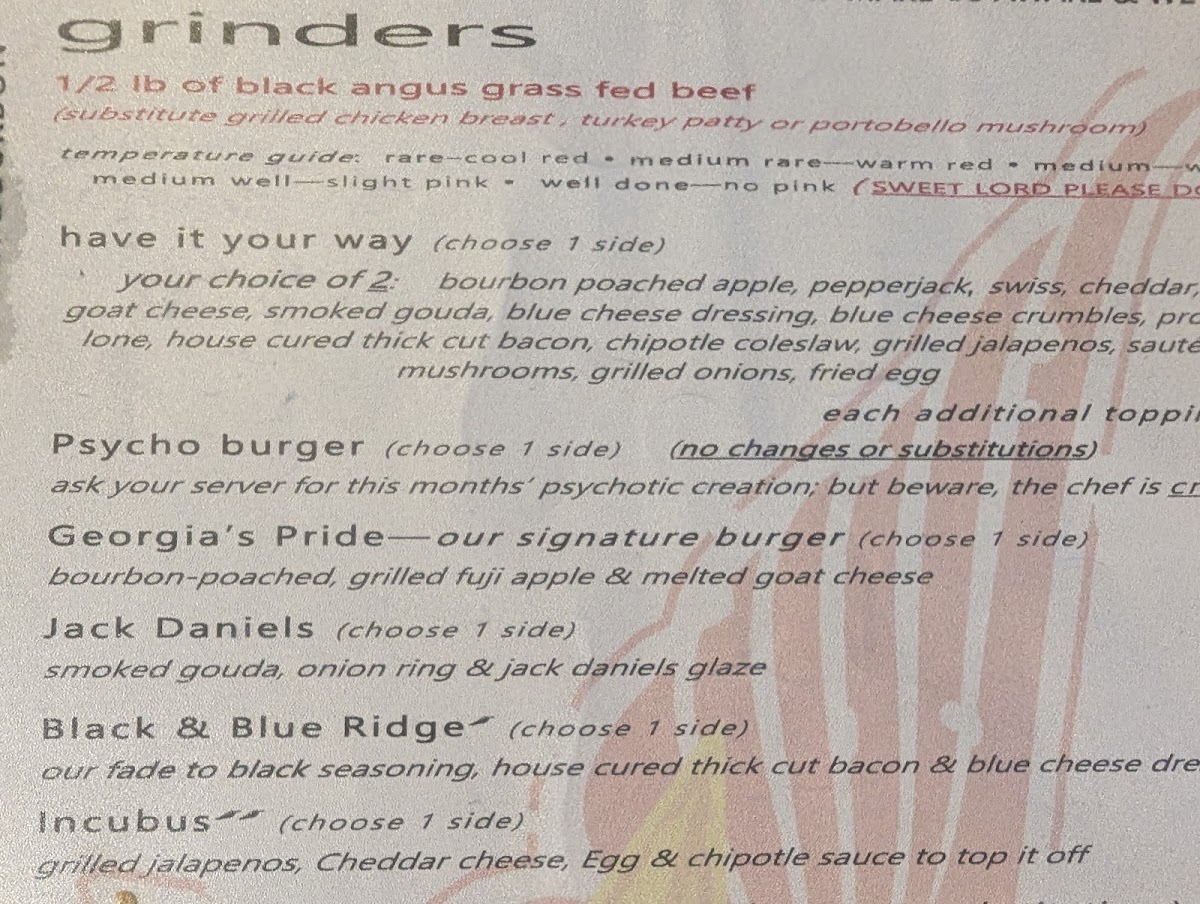 Start your journey with the Mammoth, a colossal serving of house-made tortilla chips or fries, smothered in chili and beer cheese. The Georgia's Pride burger, adorned with bourbon-poached apples and goat cheese, delights those seeking flavor. While options like the Psycho Burger test culinary creativity, the crisp OMG! World's Greatest Salad ensures there's something for everyone.